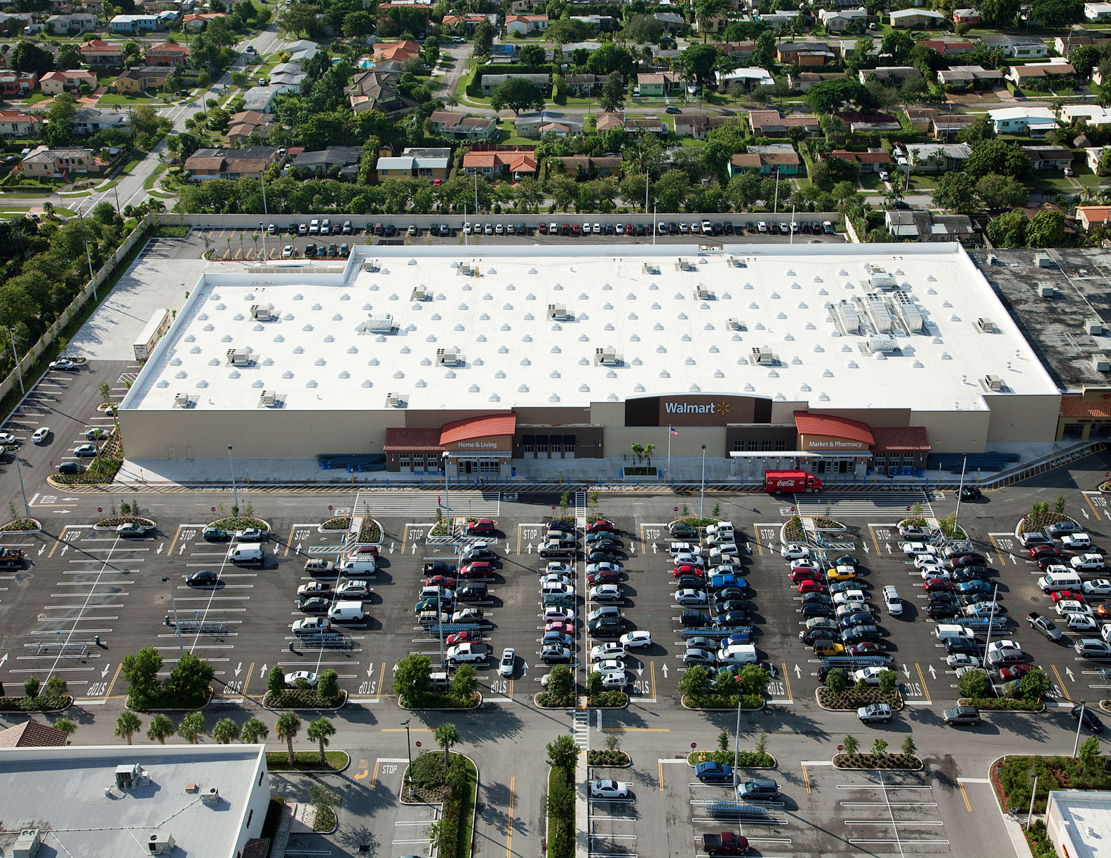 The stores have exposed ceiling beams with groceries, fresh produce and consumer goods such as clothing, fitness equipment, furniture, toys, appliances, and electronics. In addition, the super store includes medical care providers, banking outlets, and small to-go restaurants with fueling stations.